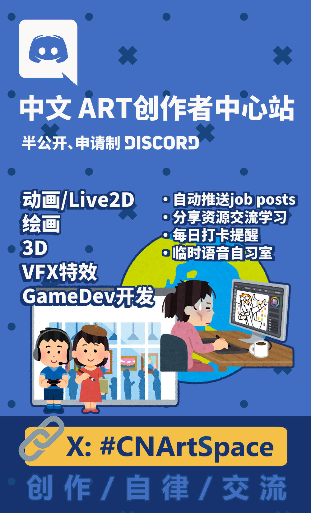 繪畫 / Live2D 動畫 / 3D / VFX / GameDev 全面涵蓋【简/繁中】創作者的聚集地,大家可以交流學習、分享資源、參加每日打卡活動,一起成長!